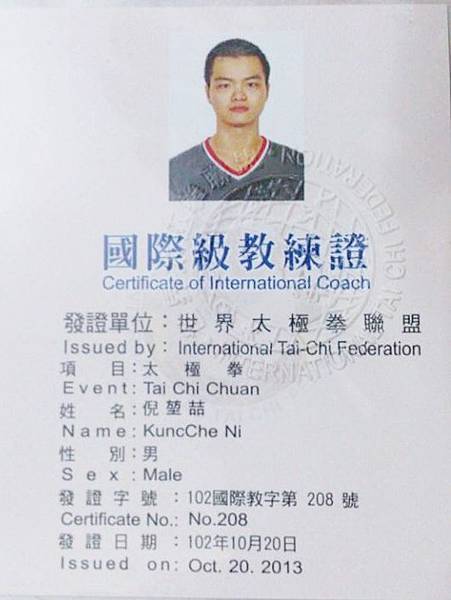 本中心倪堃喆教練與天羽教練,於本月參加由世界太極拳聯盟所舉辦的國際級教練講習會,訓練期滿並經考核成績合格,獲授予國際級教練資格。