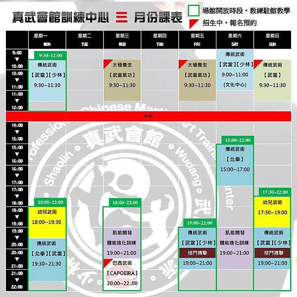 為提升教學品質與效率,本中心新增開放時段(課表上的綠色方框)。中心開放時段有教練駐場教學,若是該時段有標註特定課程,則以標註的課程為主,而如果該時段沒有標註特定課程(空白),學員仍可隨到隨學或報名體驗課程。另外,繳交吃到飽月費的學員可於開放時段到館自由練習或使用館內健身訓練設施。
